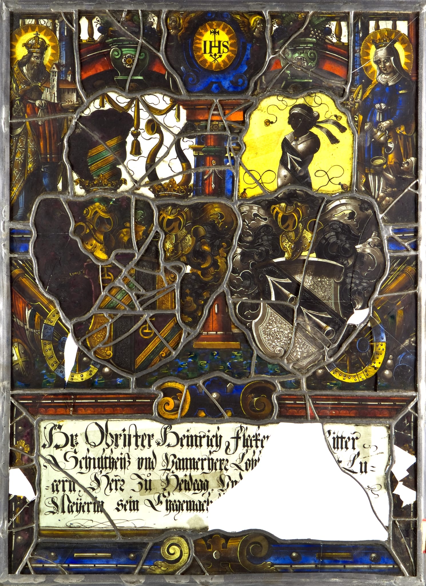 Arms of husband and wife are set within an elaborate baroque architectural frame. The shields are surmounted by barred helms with rich mantling of the heraldic colors. Their crests are silhouetted against white and yellow ribboned grounds. A balustrade extends across the top of the panel; it surmounts a red double arch whose center presents a shield with the IHS monograph for Jesus within a blue cartouche. At the sides are the name saints of the donors, to the left the Holy Roman Emperor Henry II who carries the cathedral of Bamberg, and to the right, Elizabeth of Hungary who gives food to a beggar. In the level below them are depictions of military equipment including cannon, shields, and lances. The lower third of the panel is occupied by the inscription panel. A rectangular text on uncolored glass is set within a red and blue border embellished with three-dimensional scroll work at top and bottom.
