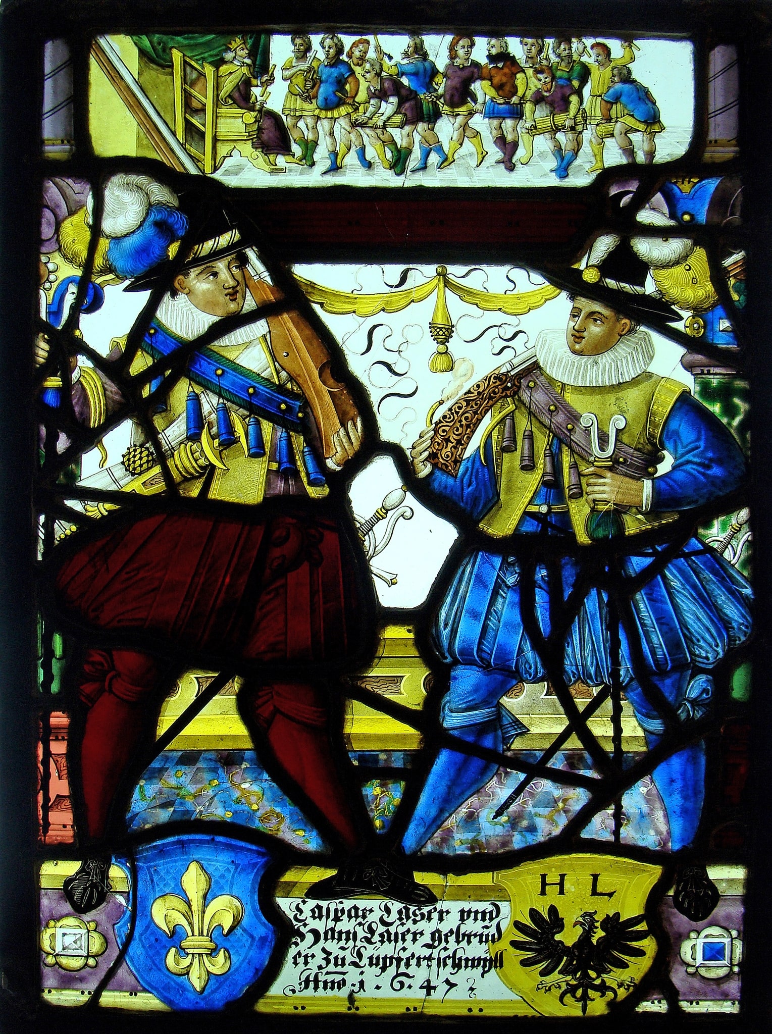 The two brothers stand in the center of the panel. Both carry muskets and have belts with powder charges attached. They also carry musket rests (also called musket forks); Hans, the brother on the right, also holds a glowing match with which he will light the musket. They stand on a blue, yellow, and purple tiled floor. The traditional columns at the side are minimized. Above the lintel is the story of the death of Scilurus and his warning to his sons about the importance of unity. The inscription plate in the lower border is flanked by arms. At the far sides, segments are painted to resemble jeweled inserts.