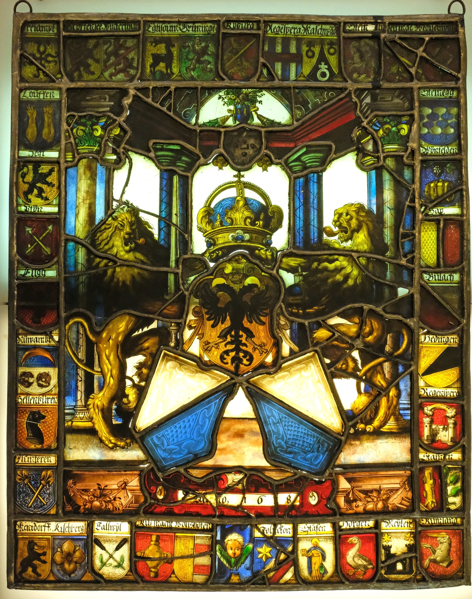 In the center, in a pyramid form, two shields of the Canton of Zurich are surmounted by that of the Holy Roman Empire with its Imperial Crown. They are flanked by rampant lions, one holding and orb and the other a sword. They stand against an arcade of gold columns against blue pilasters with green capitals, supporting a red lintel. A curved vault is overhead. At the far end is a lunette opening showing a festooned vase with fruits and flowers. Below the arms is a cartouche with a wide red border that displays the date. To either side are architectural moldings with swags and fruit. Surrounding the panel on all four sides are the multi-colored coasts of arms of Zurich’s thirty-five associated localities.
