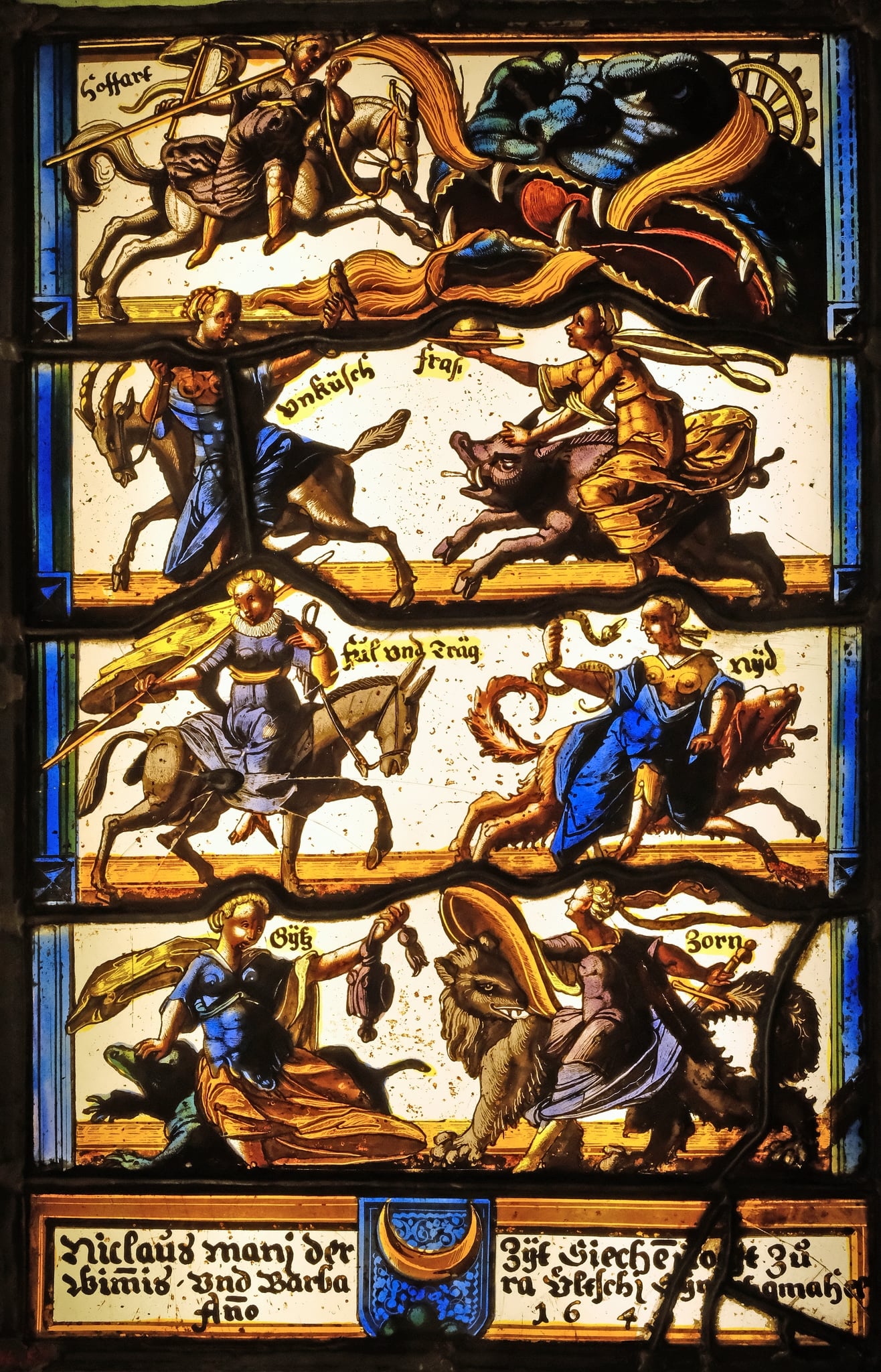 Symbolic representations of human vices are depicted in four horizontal bands. The vices take a female form and are mounted on a variety of beasts. At the top is Pride who rides a magnificent horse and charges towards the jaws of hell. Hell is a fabulous beast, a blue reptilian head with a maw lined with teeth, exuding orange-colored flames. On the next level, Luxuria, sexual depravity, rides a goat, a traditional symbol of lust. She is dressed in blue but is bare breasted and holds a parrot in her outstretched left hand. She turns to look behind her to see Gluttony riding a pig. Gluttony is dressed in yellow and holds out a platter of food. The two vices bear similarities as both corrupt natural desires, which, used with moderation, are essential to life. Food and sexual activity ensure the continuation of the individual and of the species. Below, Sloth rides on a donkey. Clothed in a light blue dress she wears a white ruff at her neck and holds a yellow banner resting on her shoulder. She is upright and her pose is placid compared to those of her sisters. Envy is more active; wearing a deep blue robe she holds a writhing snake and rides a bear. Below, Greed appears on a tortoise. She wears a blue tight-fitting garment over chest and upper hips and holds a purse in her left hand. To her right, Wrath sits on a great bear, who turns his head and shows his teeth. She is armed with a sword and shield. The panel links vices of similar types, lust and gluttony are motivated by pleasure sought by the flesh; sloth and envy link inactivity to a concomitant desired for the goods that others have earned; and avarice is associated with wrath, suggesting that the desire to hoard for the self is supported by aggression to defend such uncharitable actions. At the bottom of the panel a horizontal inscription flanks a coat of arms in the center. An inscription panel at the bottom is divided by a coat of arms in the center.