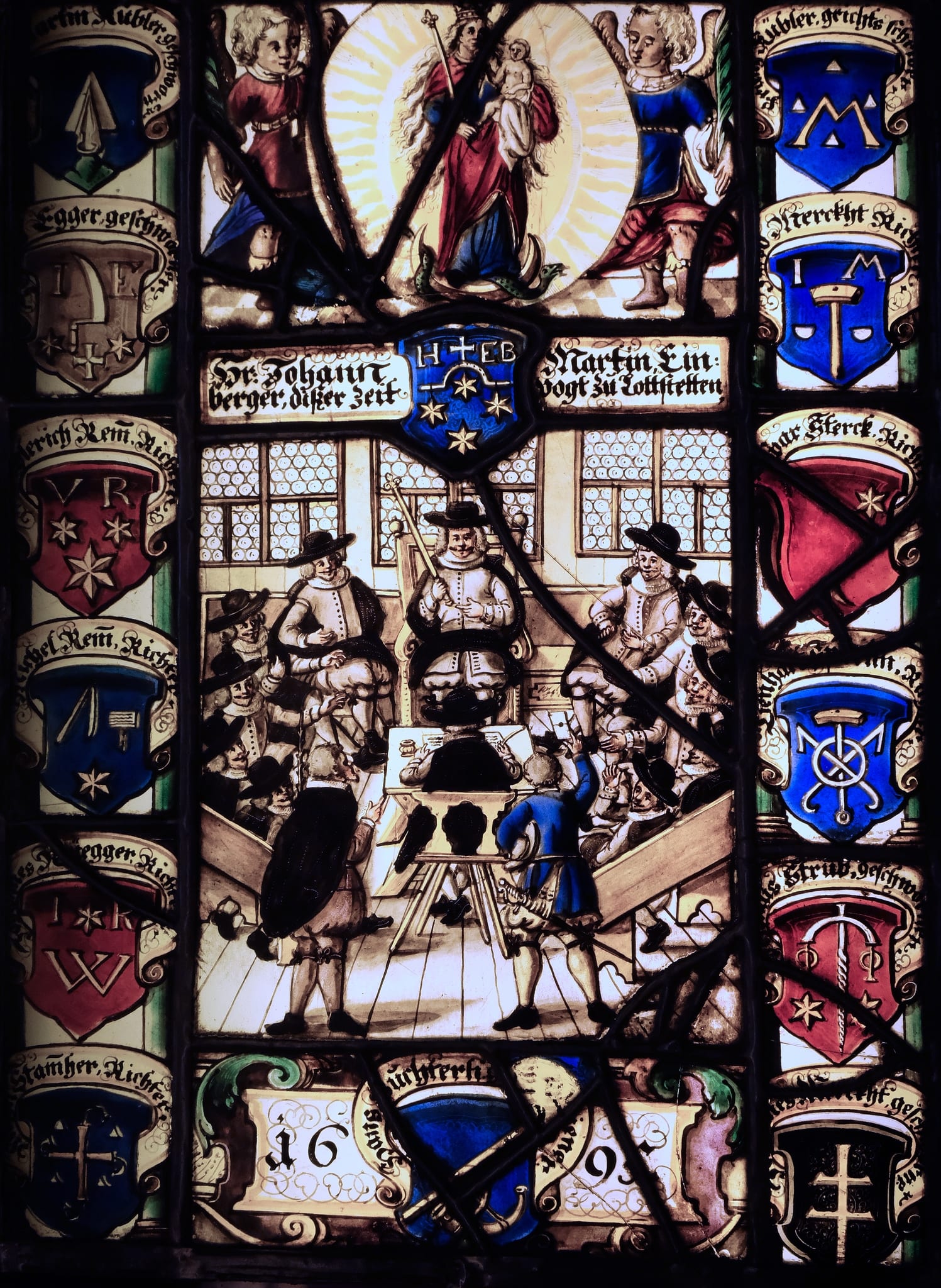 In the central panel, the Law Council meets within a room glazed with butzenscheiben (bulls’-eye window panes). One man sits in an elaborate chair in the center holding his staff of office and across from him another takes notes. Ten additional men, all dressed alike are seated, five to the right and five to the left. Two men appear at the front and gesture, the one on the right dressed in blue, the single point of color in the monochromatic rendering of the scene. At the sides of the panel, coats of arms appear in a variety of colors, six on each side. Council members’ names, most followed by the designation Richter (judge) appear above their arms. Directly above the council scene, is the devotional image of the Virgin and Child on a crescent moon flanked by angels. Below her is a coat of arms and an inscription naming the mayor. Below the council scene is a larger inscription framed by scrolls that presents another coat of arms and gives the date. All told, fourteen men are commemorated by their arms.