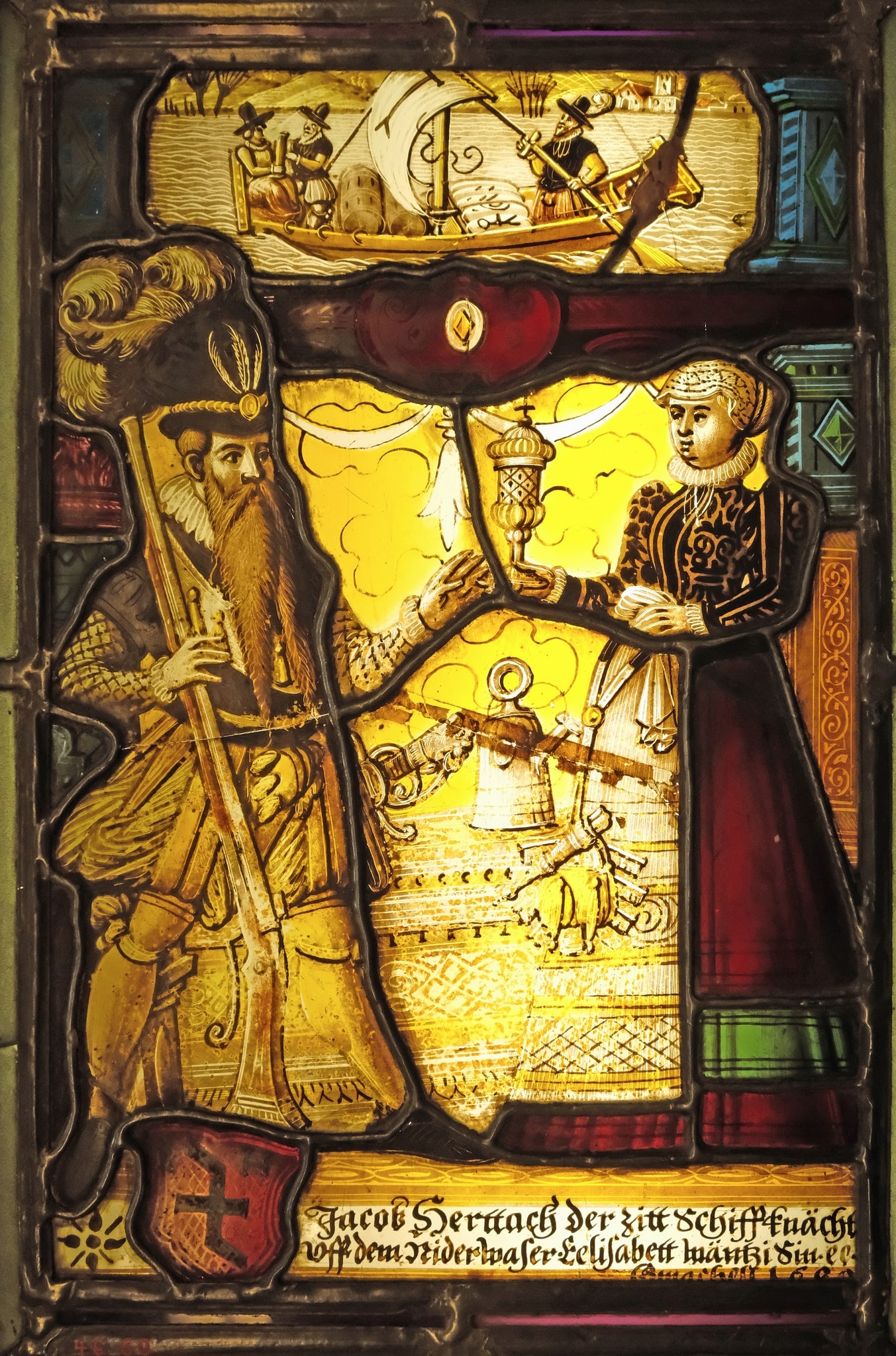 Silhouetted by a yellow, string-decorated background, the husband and wife stand on a floor inscribed with circles. The husband is depicted with a long, forked beard and he holds his rifle in his right hand, resting the butt on the floor. He wears black doublet and feathered hat over poofy trousers. The woman holds out the cup with the welcome drink to him in her right hand. She wears a cap and a narrow white ruff over a gold and black bodice with raised sleeves. Her long red skirt with a green stripe at the hem is covered in the front by a richly patterned white apron. Her purse with keys and cutlery, the sign of her management of the household, hangs from her waist over the apron. A bell appears in the background between the couple. The are framed by two differently colored pilasters supporting a red lintel with a central boss, In the upper register, blue pilasters frame a scene of transport on a lake or river. A man paddles a boat carrying five sacks and three barrels and what appears to be a male and female passenger. At the bottom of the panel, the husband’s coat of arms is between his feet and the inscription follows to the right.