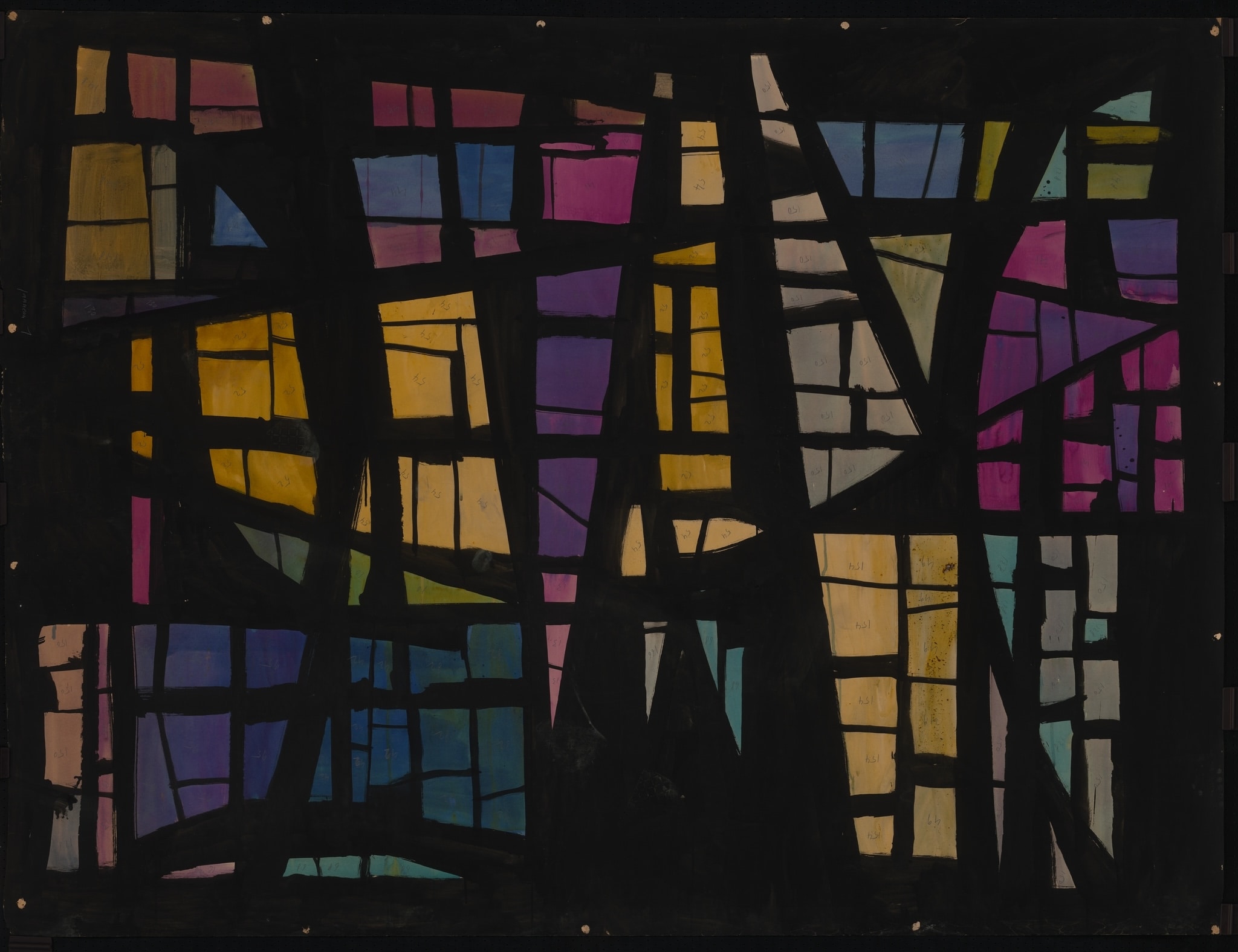 Ce carton non-figuratif a été réalisé par Bodjol en 1958 pour un vitrail en dalle de verre (GE_87.01) situé du côté Ouest de la Chapelle des Arts aux Acacias (GE). Cette oeuvre s'inscrit dans une série de seize vitraux répartis sur deux niveaux, qui consiste en la première production en dalle de verre de Bodjol. Les dessins des compositions sont créés par le réseau de béton. L'artiste justifie le choix de ce médium par sa solidité, les baies du registre inférieur de la Chapelle des Arts étant situées à proximité du sol (Delhoume, 2007, p. 5-6).