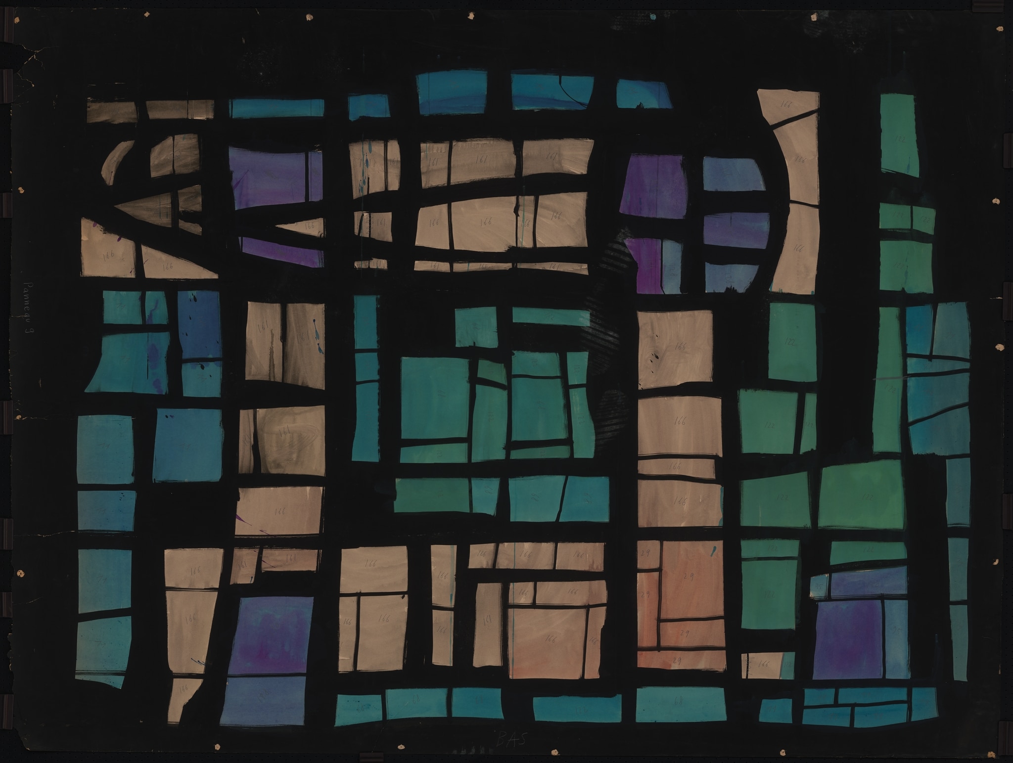 Ce carton non-figuratif a été réalisé par Bodjol en 1958 pour un vitrail en dalle de verre (GE_87.13) situé du côté Est de la Chapelle des Arts aux Acacias (GE). Cette oeuvre s'inscrit dans une série de seize vitraux répartis sur deux niveaux, qui consiste en la première production en dalle de verre de Bodjol. Les dessins des compositions sont créés par le réseau de béton. L'artiste justifie le choix de ce médium par sa solidité, les baies du registre inférieur de la Chapelle des Arts étant situées à proximité du sol (Delhoume, 2007, p. 5-6).