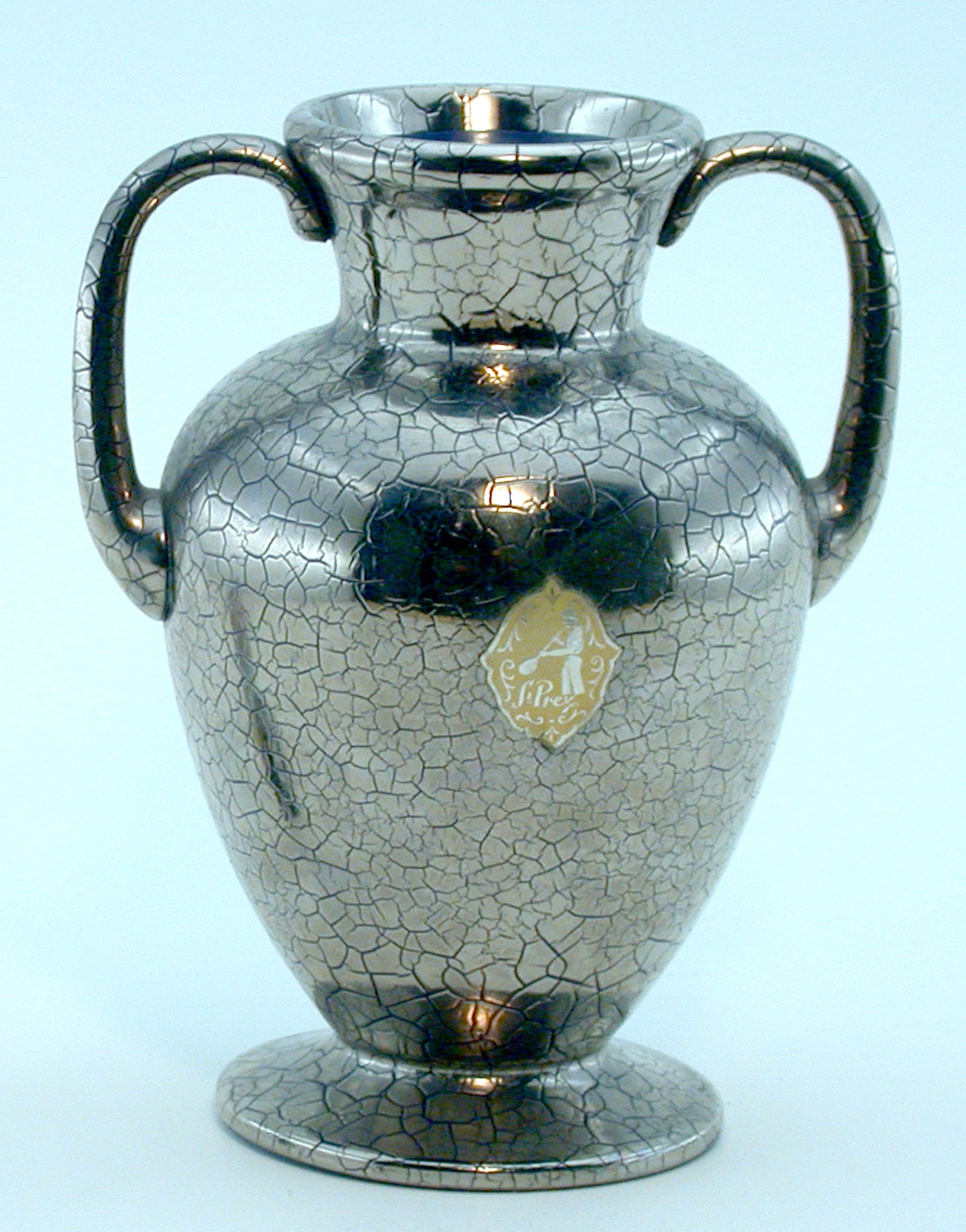 Le revêtement argenté craquelé du vase proposé ici est en usage dès 1931. Selon la liste de prix de 1951, ce dernier est alors remplacé par un nouveau revêtement dénommé «platine» (Walther, 2025, 65). Notre vase a donc été réalisé entre 1949 et 1951.