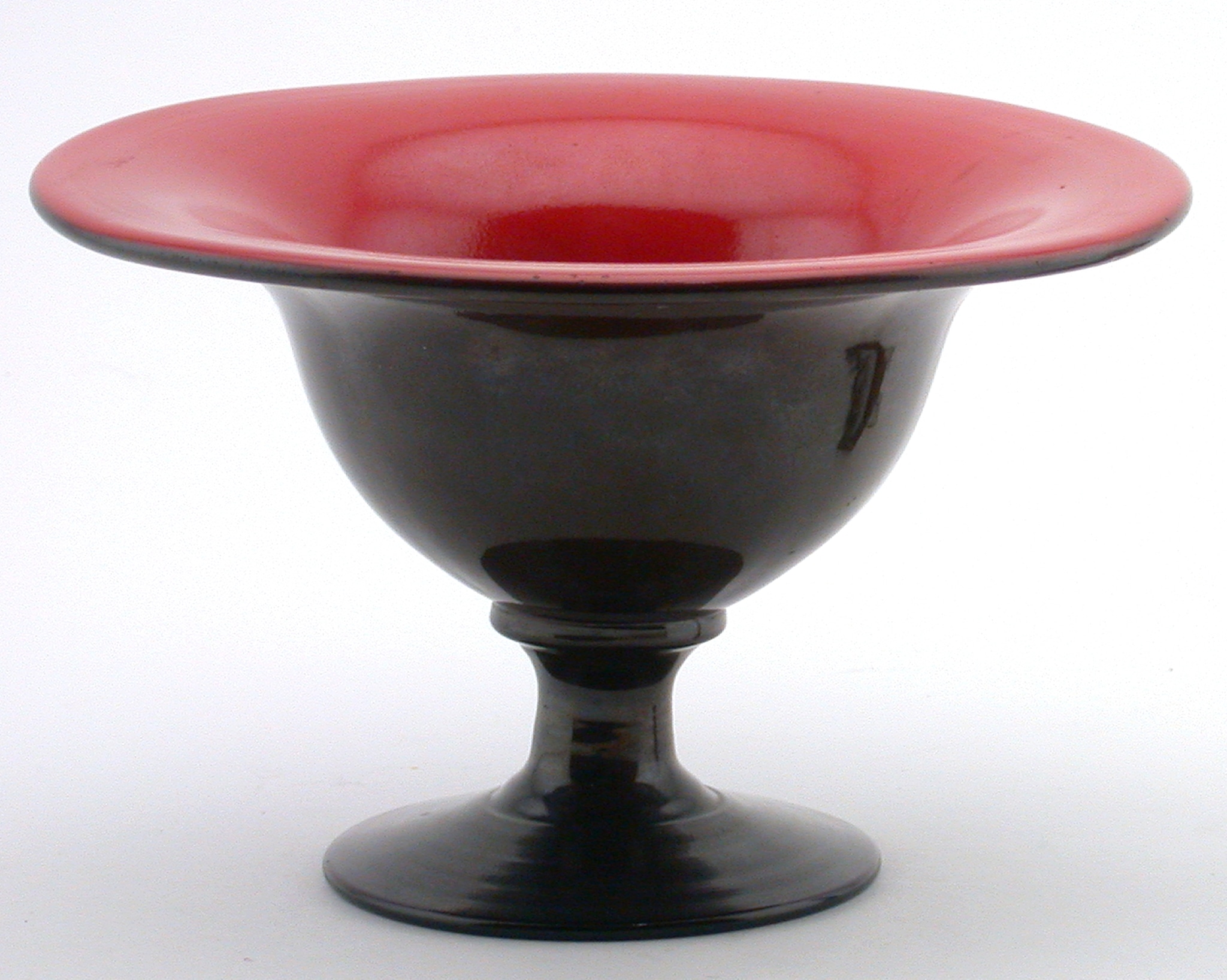 Verre vert soufflé en moule, piédouche appliqué, lèvre largement évasée, revêtement: verre doublé brun/noir et rouge, forme: coupe