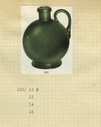 Ce modèle de vase (101) fut créé à une période précoce de la Verrerie artistique (1930-1964). Les sources dont nous disposons sont des catalogues de la Verrerie de St-Prex, certains inédits, tels que les albums noirs munis de photographies de vases, vraisemblablement utilisés par les représentants de 1931 à 1935. Le vase boule y figure comme no 9, 164 et 172, avec et sans anse (Verreries de St-Prex, 1931, D 15, 18, 20 cm). Il est proposé en verre vert, émaillé rouge, noir et bleu, ou en argenté craquelé. Ce modèle fait également partie de l’offre du premier catalogue de vente imprimé de 1935 (Verreries de St-Prex, 1935, p. 6, 12 et 13), où il est proposé en verre vert, or bordé et émaillé rouge brillant. Dans un répertoire non publié, qui est basé sur les numéros d’inventaire des catalogues de 1935 à 1960 et qui dresse la liste de tous les modèles de la production artistique (Verreries de St-Prex, 1964), ce vase boule est présenté en quatre variantes, selon le diamètre et la présence d’une anse : le no 100 (sans anses) et le no 101 (avec anses) pour un diamètre de 10, 12, 14 et 16 cm, puis le no 102 (sans anses) et le no 103 (avec anse) pour un diamètre de 22 cm. On peut encore relever que la lampe boule (modèle 176) est identique au modèle 100, mais que le col a fait place au dispositif électrique. Dans le catalogue de 1960 (Verreries de St-Prex, 1960), les vases boules ne sont plus proposés. D’après les sources citées, ce modèle a été élaboré dès 1931. La critique récente ne le mentionne pas. En revanche, le céramiste Paul Ami Bonifas consacre un article à la "verrerie" en 1933 où quatre vases boules réalisés à Saint-Prex en 1931 illustrent son propos (Bonifas, 1933, 16-17).