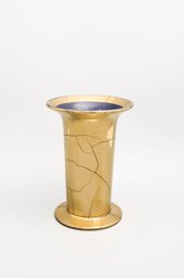 Le décor doré craquelé du vase présenté ici est emblématique de la Verrerie artistique, son apparition coïncidant avec la publication du catalogue de 1935. La qualité du craquelé – large et brillant – est caractéristique de l’après-guerre, alors que l’émail bleu utilisé précédemment n’était plus disponible (Walther, 2025, 65).