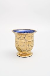Verre incolore soufflé en moule, lèvre évasée, pied appliqué à chaud, revêtement d'émail bleu appliqué à l'aérographe, recouvert d'argent qui se craquelle durant la recuisson; forme: panse balustre