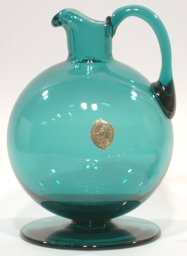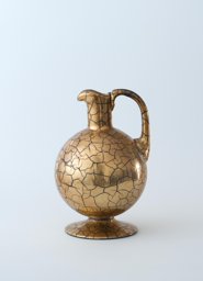 Verre vert soufflé en moule, col droit, bec verseur, pied et anse appliqués; revêtement émaillé bleu puis doré, les craquelures irrégulières apparaissant lors de la cuisson qui fixe le décor; forme: panse sphérique