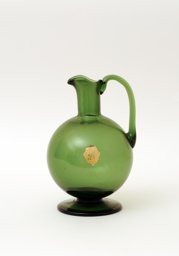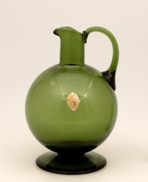 Ce modèle de cruche (521) est une création nouvelle pour le catalogue de 1935. Les sources dont nous disposons sont des catalogues de la Verrerie de St-Prex, certains inédits, tels que les albums noirs munis de photographies de vases, vraisemblablement utilisés par les représentants de 1931 à 1935, dont notre modèle s’inspire. On y trouve le no 172, une carafe à col court ou long, avec pied ou talon (Verreries de St-Prex, 1931). Le modèle présenté ici fait partie de l’offre du premier catalogue de vente imprimé de 1935 (Verreries de St-Prex, 1935, 10), où il est proposé en verre vert. On le retrouve ensuite comme "cruche pour service à vin et à liqueur" (Verreries de St-Prex, 1939, 31). La publication qui commémore les 30 ans de la verrerie le propose également (Chable, 1941, 32). Dans un répertoire non publié, qui est basé sur les numéros d’inventaire des catalogues de 1935 à 1960 et qui dresse la liste de tous les modèles de la production artistique (Verreries de St-Prex, 1964), cette cruche est présentée avec deux diamètres différents (12 et 14 cm). On la voit également sur le calendrier promotionnel de 1962.