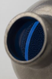 À en juger son diamètre, le vase présenté ici a été réalisé avant 1935. En effet, il est muni du timbre des premières années, placé sous le fond (Dreyfus, 1981, 16). Il manifeste plusieurs particularités: les vases boules se terminent en général par une lèvre retournée ou évasée. Ici, le col a été meulé avant d’être émaillé, peut-être pour en faire un pied de lampe. Le revêtement est lui aussi particulier: argenté craquelé, avec une bande médiane en doré craquelé, bordée de bleu. Comme le doré craquelé n'est pas documenté avant 1935, il pourrait s'agir de l'un des premiers exemples de ce revêtement emblématique.