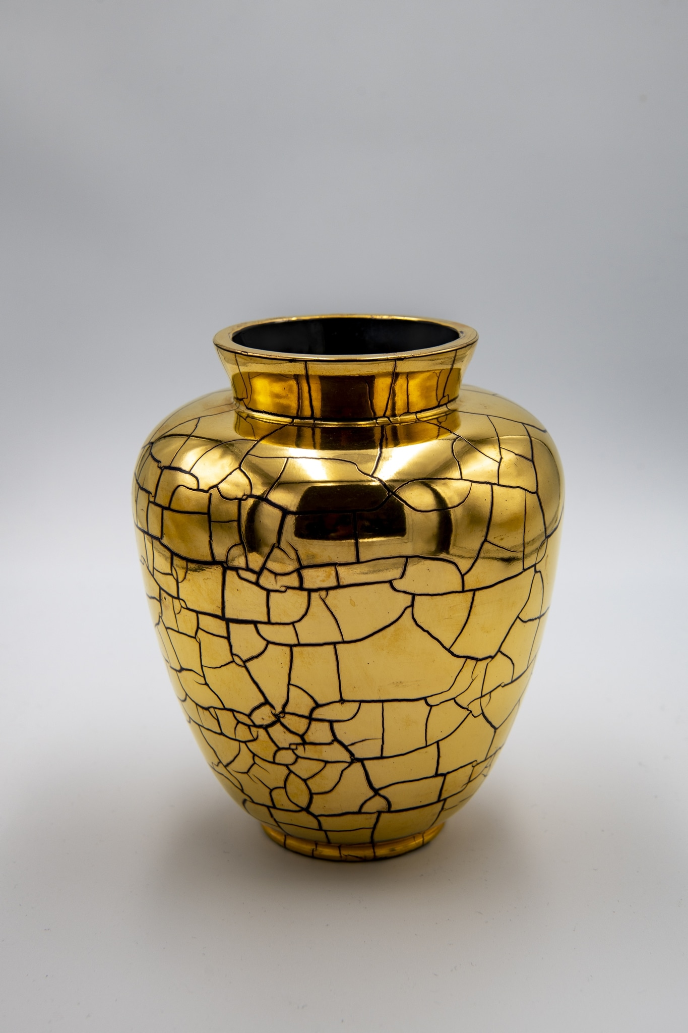 Le décor doré craquelé du vase présenté ici est emblématique de la Verrerie artistique, son apparition coïncidant avec la publication du catalogue de 1935. La qualité du craquelé évoque une phase transitoire entre le serré et peu brillant des débuts et le craquelé large et brillant de l’après-guerre, période marquée par la disparition de l’émail bleu initial (Walther, 2025, 65).