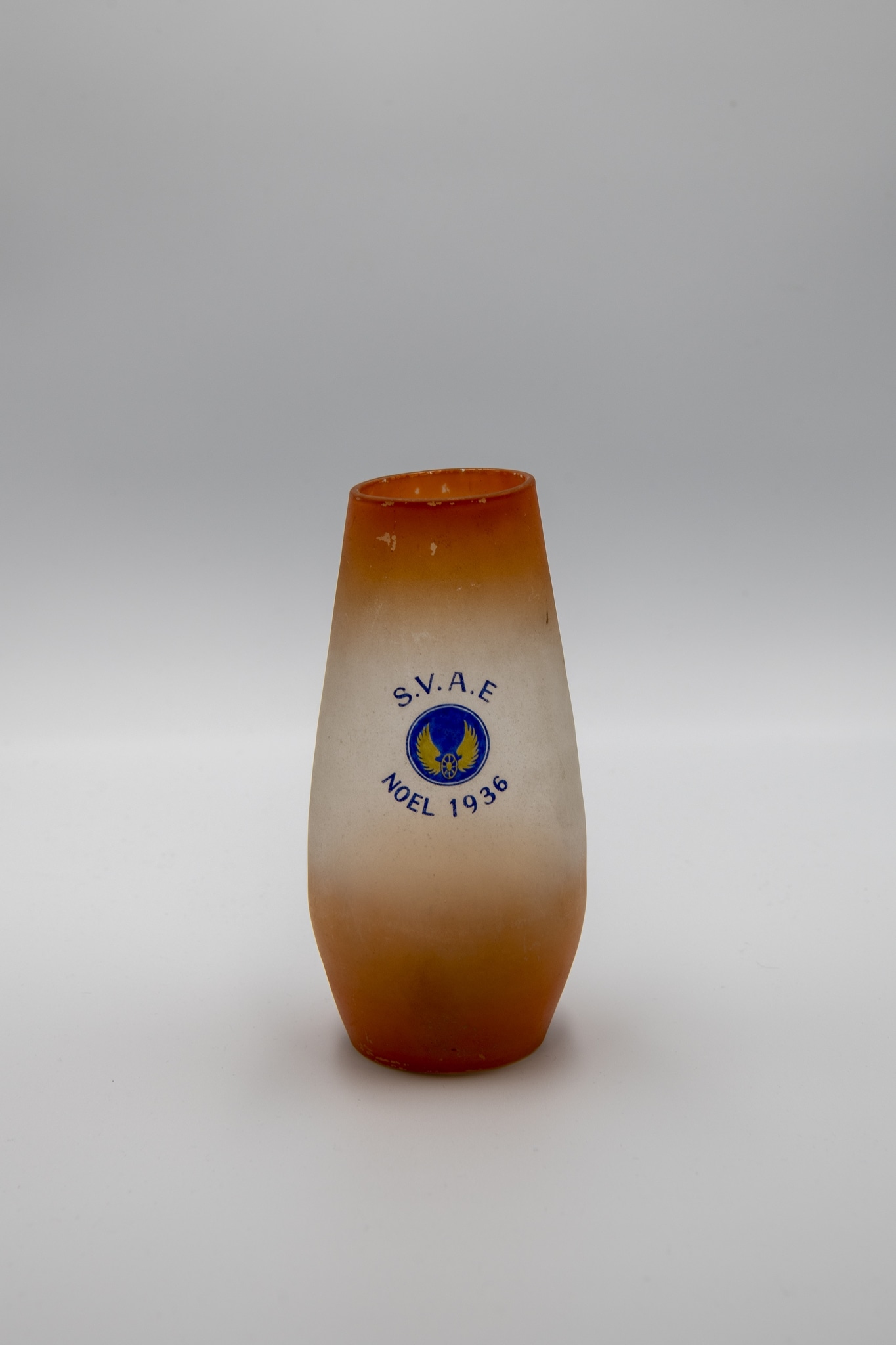 Vase en verre incolore sablé. Le bas et le haut de la panse sont de couleur orange, probablement appliquée à l'aérographe. Au centre se trouve une inscription commémorant le Noël 1936 de la S.V.A.E., probablement la Société Vaudoise d'Assurances Mutuelles contre les Accidents. On y reconnaît aussi la roue ailée, entre autres, symbole des CFF (Chemin de Fer Fédéraux).