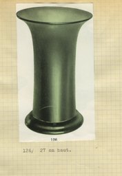 Ce modèle de vase (126) fut créé à une période précoce de la Verrerie artistique (1930-1964). Les sources dont nous disposons sont des catalogues de la Verrerie de St-Prex, certains inédits, tels que les albums noirs munis de photographies de vases, vraisemblablement utilisés par les représentants de 1931 à 1935, où ce modèle porte le no M1. Il est disponible en verre vert, émaillé rouge, bleu ou noir ainsi qu’argenté craquelé (Verreries de St-Prex, 1931, H 30 cm). Ce modèle fait également partie de l’offre du premier catalogue de vente imprimé de 1935 (Verreries de St-Prex, 1935, 3), où il est présenté en verre vert. Il figure ensuite dans un répertoire non publié, qui, basé sur les numéros d’inventaire des catalogues de 1935 à 1960, dresse la liste de tous les modèles de la production artistique (Verreries de St-Prex, 1964, H 27 cm). La liste de prix de 1960 le propose également en plus petit (Verreries de St-Prex, 1960, H 16 cm). D’après les sources, ce modèle a été ainsi élaboré dès 1931 et produit jusqu’en 1964.