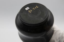 Avec le timbre doré des premières années, le vase présenté ici a assurément été réalisé avant 1935. Soufflé en moule à côte ("rigadin" à Venise), il correspond en effet au modèle no 175 du premier catalogue. En revanche, le revêtement émaillé noir a été utilisé de 1931 à 1964.