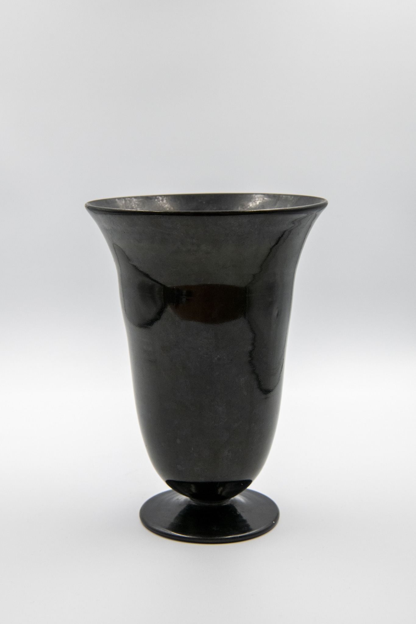 Le vase émaillé en noir présenté ici, muni du timbre doré sous le fond, est typique de la production de 1931 à 1935.