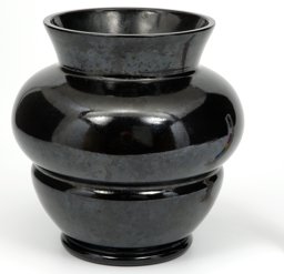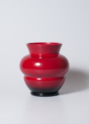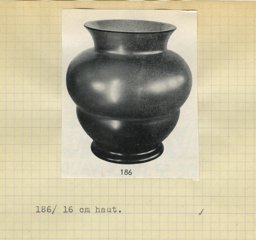 Ce modèle (186) de vase de la Verrerie artistique (1930-1964) a été commercialisé dès 1937. Les sources dont nous disposons sont des catalogues de la Verrerie de St-Prex, certains inédits. Il fait partie de l’offre des "Nouveautés", publiée en 1937 (Verreries de St-Prex, 1937, H 16 cm), qui est disponible en verre vert (VV), émaillé en noir, rouge-brillant et rouge-mat (N, RB et RM), en bleu-brillant et bleu-mat (BB et BM), en argenté lustré et craquelé (AL et AC), et finalement en or bordé, lustré ou craquelé (OB, OL et OC). Il figure finalement dans un répertoire non publié, qui, basé sur les numéros d’inventaire des catalogues de 1935 à 1960, dresse la liste de tous les modèles de la production artistique (Verreries de St-Prex, 1964, H 16 cm). D’après les sources, ce modèle est ainsi mis en vente dès 1937 et produit jusqu’en 1964. Seul Dreyfus le retient dans la littérature secondaire (Dreyfus, 1981, 13 et 26).