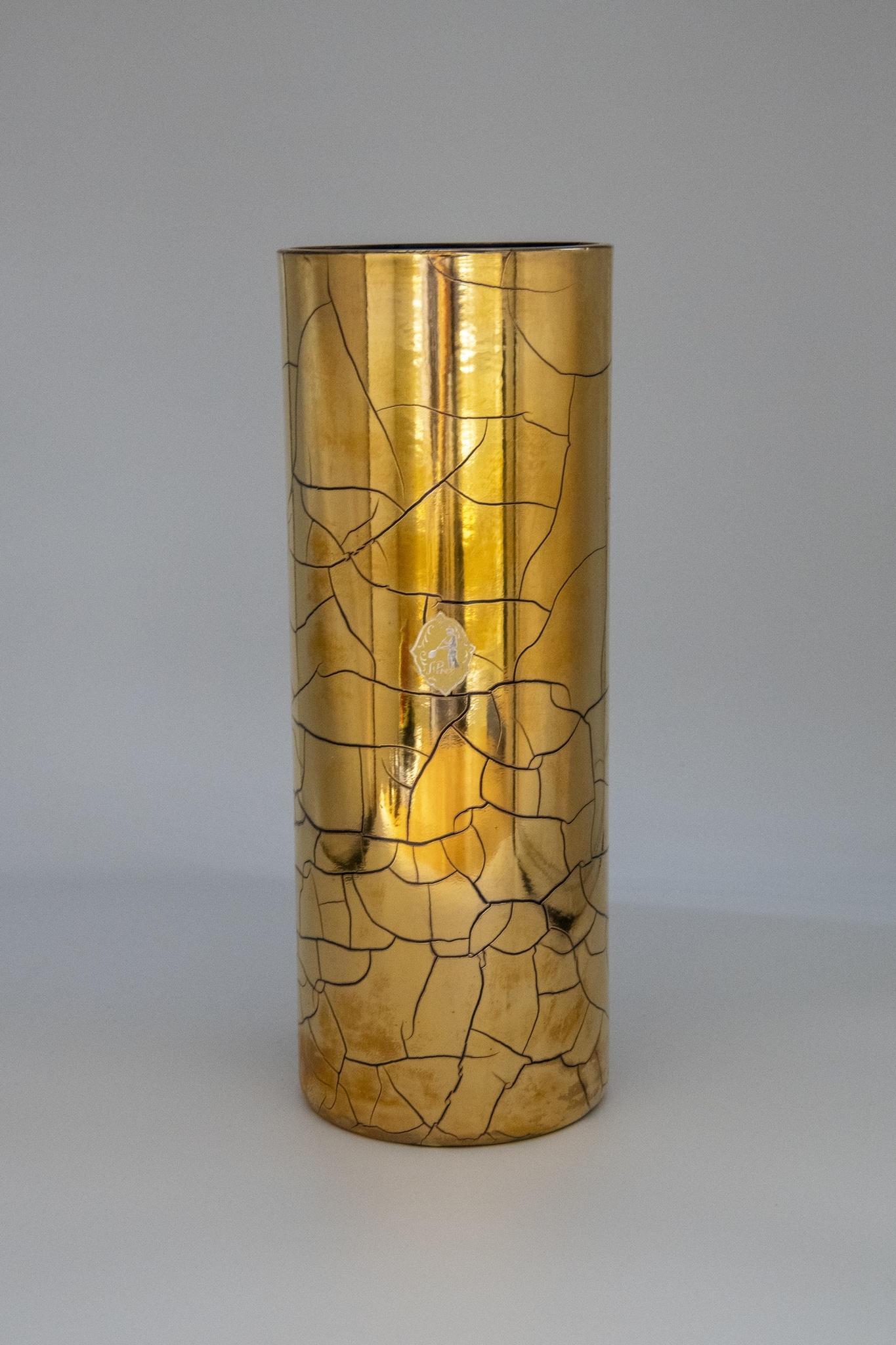 Le décor doré craquelé du vase présenté ici est emblématique de la Verrerie artistique, son apparition coïncidant avec la publication du catalogue de 1935. La qualité du craquelé – large et brillant – est caractéristique de l’après-guerre, alors que l’émail bleu utilisé précédemment n’était plus disponible (Walther, 2025, 65).