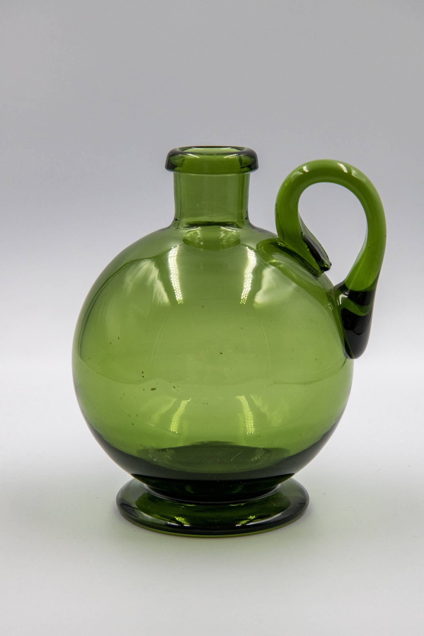 Verre vert soufflé en moule, anse et pied appliqués à chaud; forme sphérique