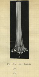 Il figure ensuite dans un répertoire non publié, qui, basé sur les numéros d’inventaire des catalogues de 1935 à 1960, dresse la liste de tous les modèles de la production artistique (Verreries de St-Prex, 1964, H 47 cm, 40 cm, 35 cm, 30 et 17 cm). D’après les sources, ce modèle a été ainsi élaboré dès 1930 et produit jusqu’en 1935 environ. La critique récente ne le mentionne pas.