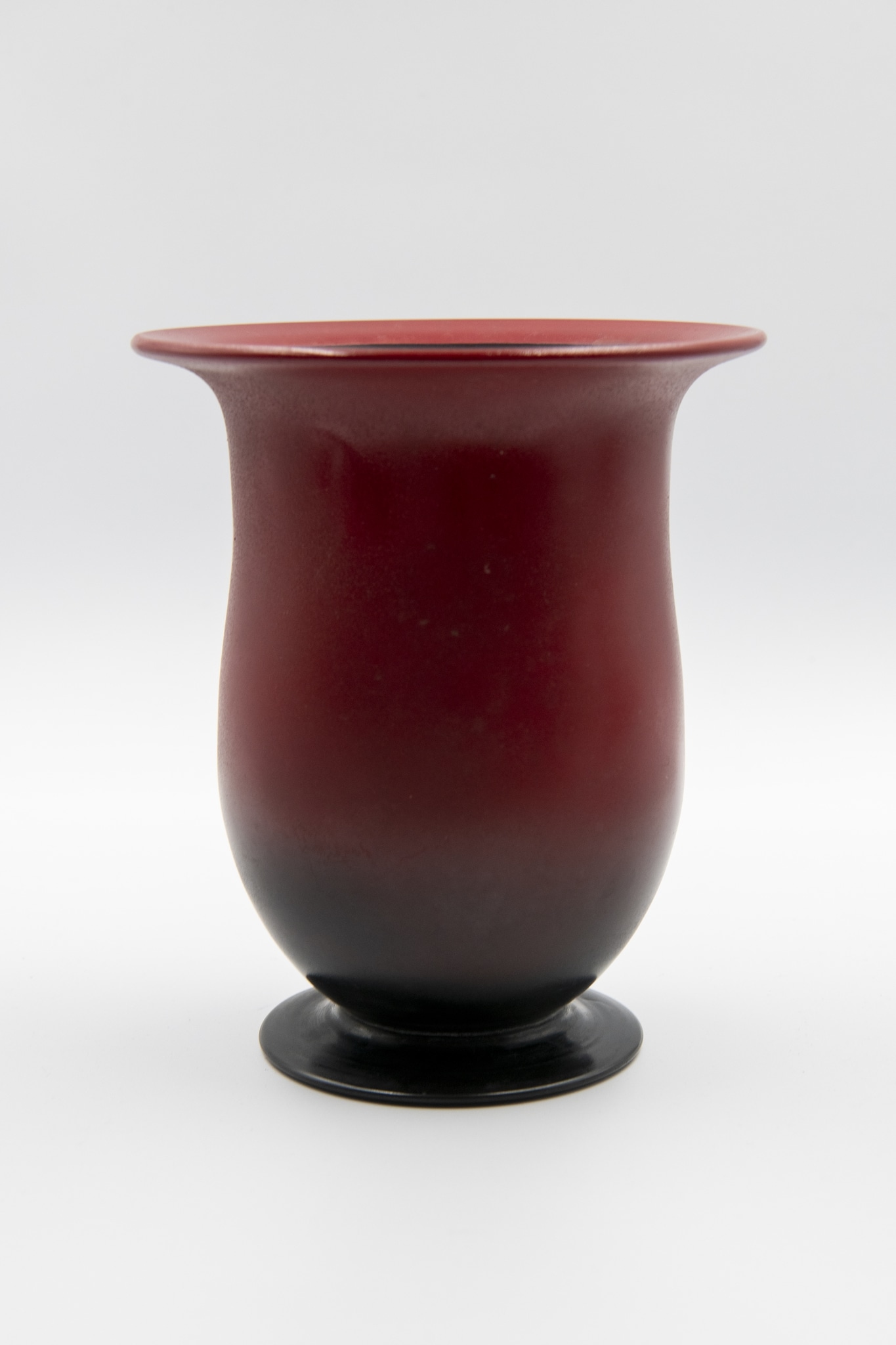 Verre turquoise soufflé en moule, lèvre évasée, pied appliqué, revêtement émaillé noir et rouge mat posé à l'aérographe; forme: panse balustre