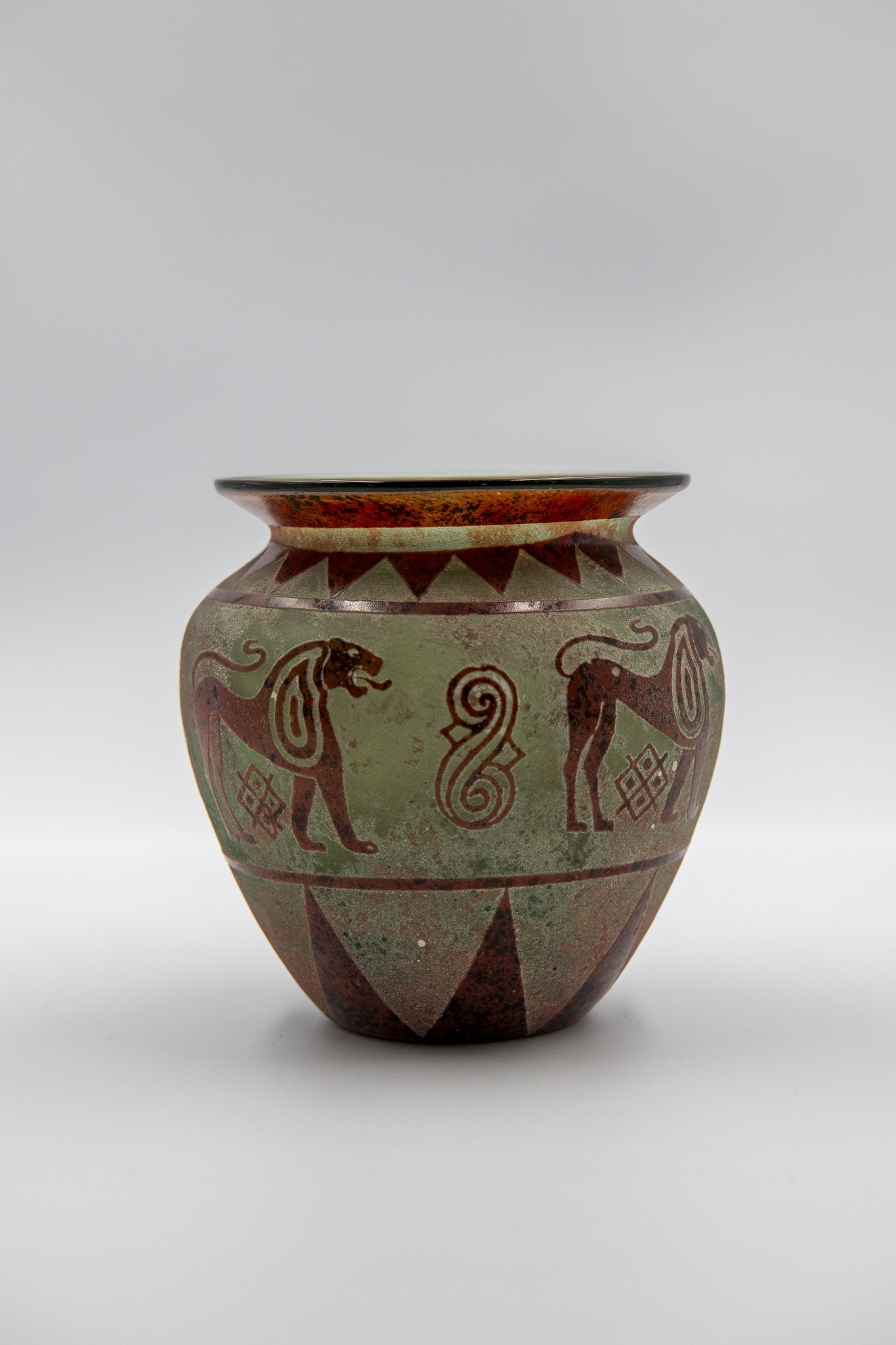 Lions et motifs géométriques placés en frise autour de la panse. Le modèle exact utilisé par Frantisek Landgraf a pu être déterminé grâce à un livre qui se trouve dans les archives du Musée du Verrier (Nicole, 1926, pl. VI). Le lion, ainsi que deux motifs décoratifs sont identiques au modèles.