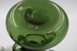Verre vert soufflé en moule, fond concave, anses à retours pincés appliquées sur la panse et le col galbé, lèvre évasée; forme: panse bulbeuse à resserrement