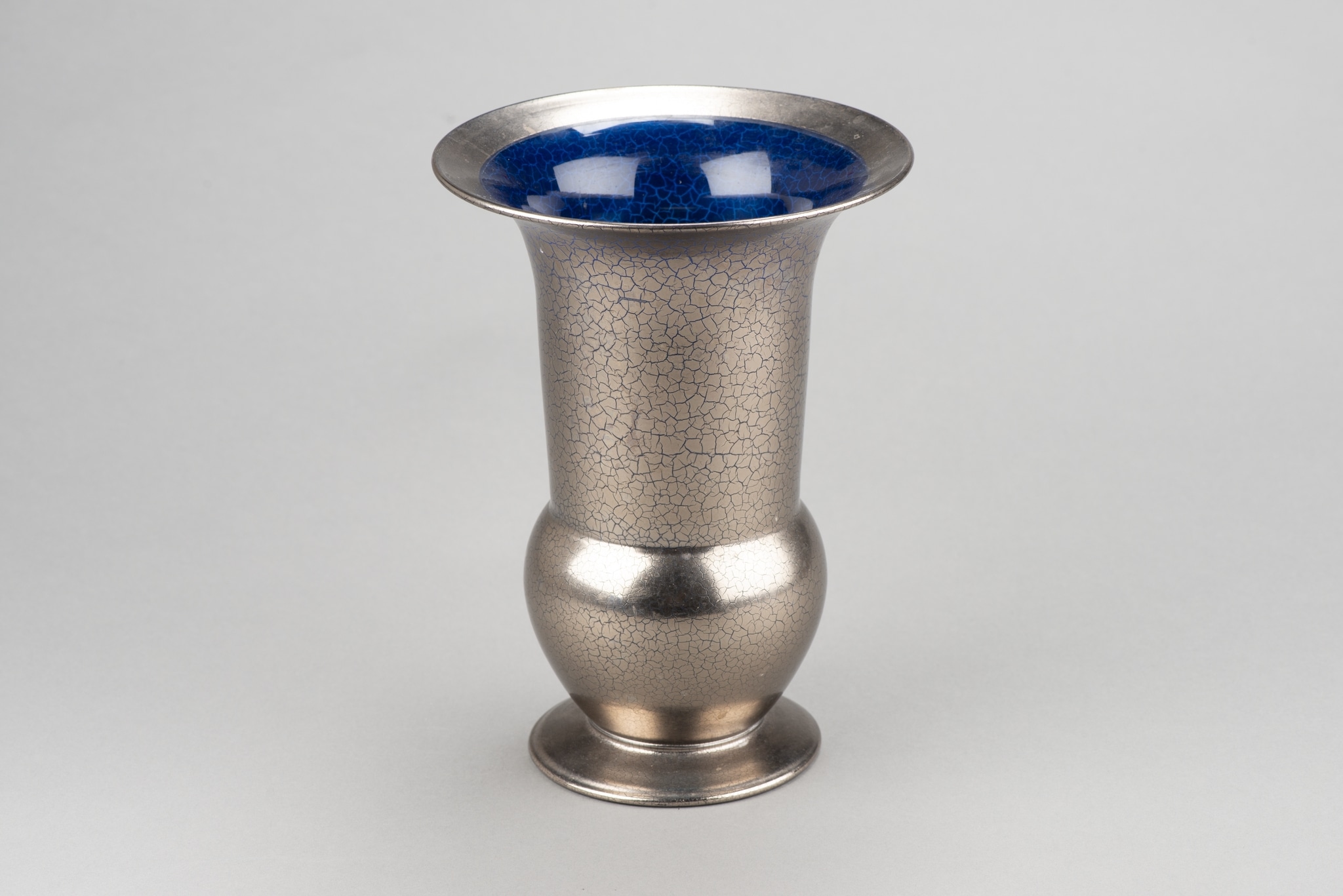 Le vase présenté ici est muni d'un revêtement argenté craquelé en usage dès 1931. Selon la liste de prix de 1951 (Verreries de St-Prex, 1951), ce dernier est alors remplacé par un nouveau revêtement dénommé «platine» (Walther, 2025, 65). Notre vase a donc été réalisé entre 1937 et 1951.