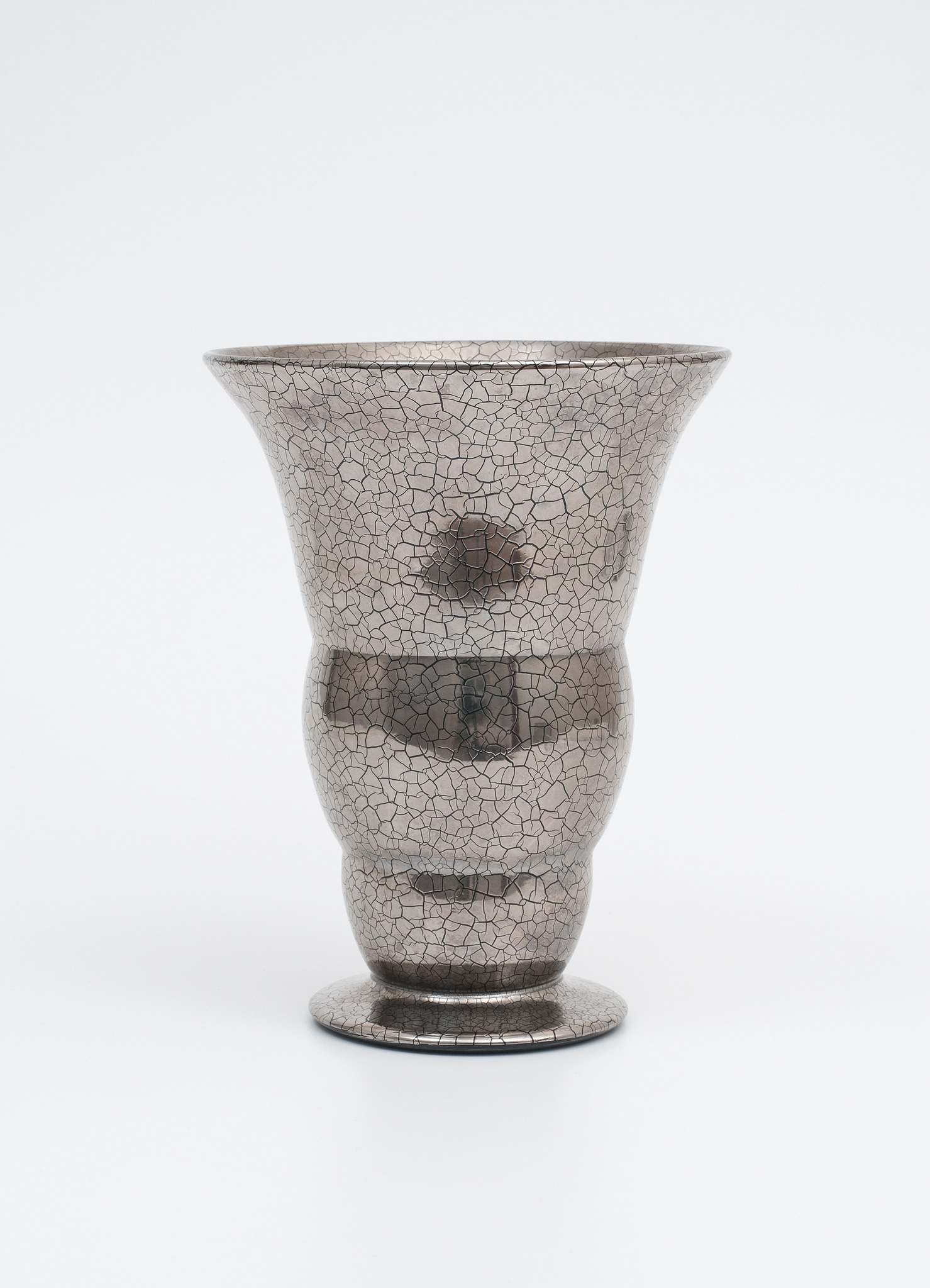 Le vase proposé ici, produit à partir de 1937, est muni d'un revêtement argenté craquelé, en usage dès 1931. Selon la liste de prix de 1951, ce dernier est alors remplacé par un nouveau revêtement dénommé «platine» (Walther, 2025, 65). Notre vase a donc été réalisé entre 1937 et 1951.