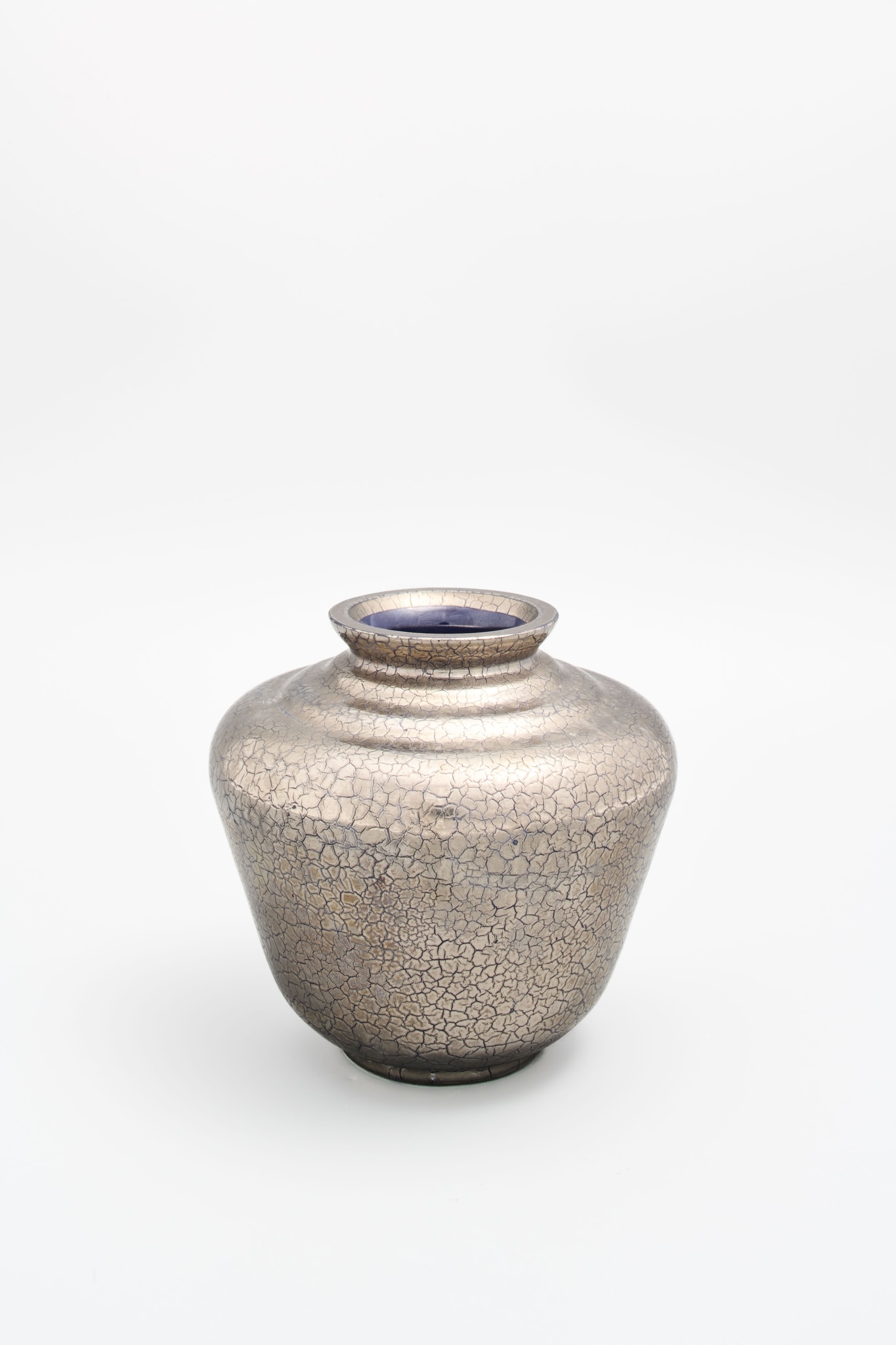 Le revêtement argenté craquelé du vase proposé ici est en usage dès 1931. Selon la liste de prix de 1951, ce dernier est alors remplacé par un nouveau revêtement dénommé «platine» (Walther, 2025, 65). Notre vase a donc été réalisé entre 1949 et 1951.