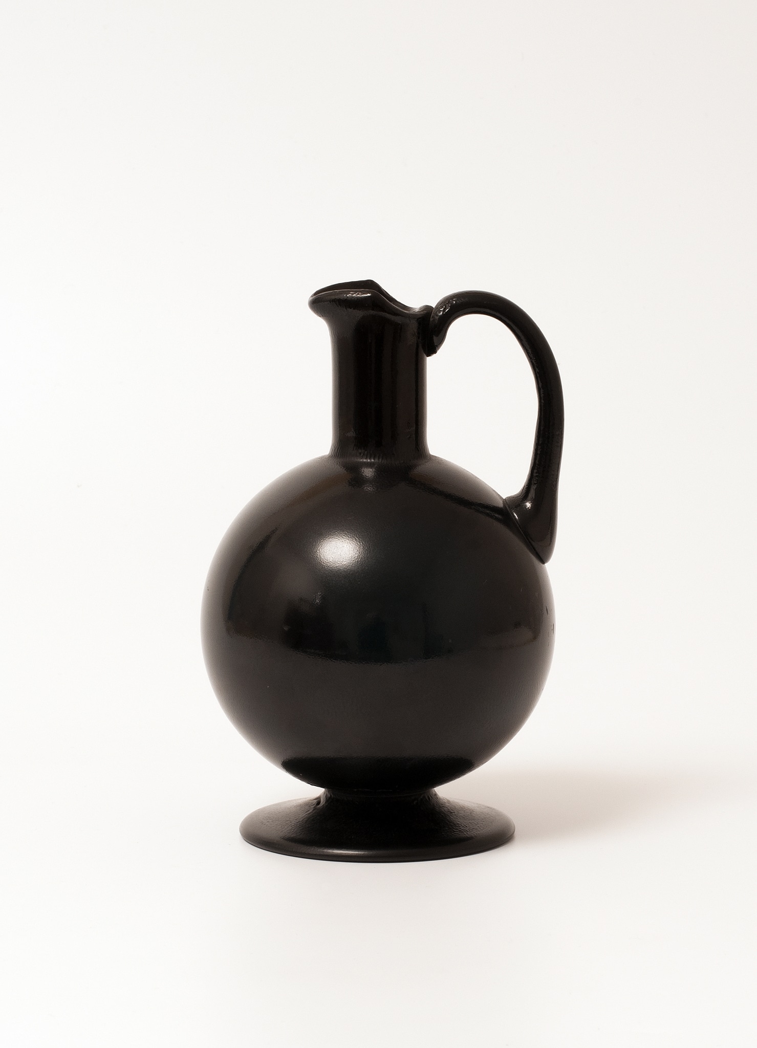 Verre vert soufflé en moule, col droit, bec verseur, pied et anse appliqués; revêtement émaillé noir posé à l'aérographe; forme: panse sphérique