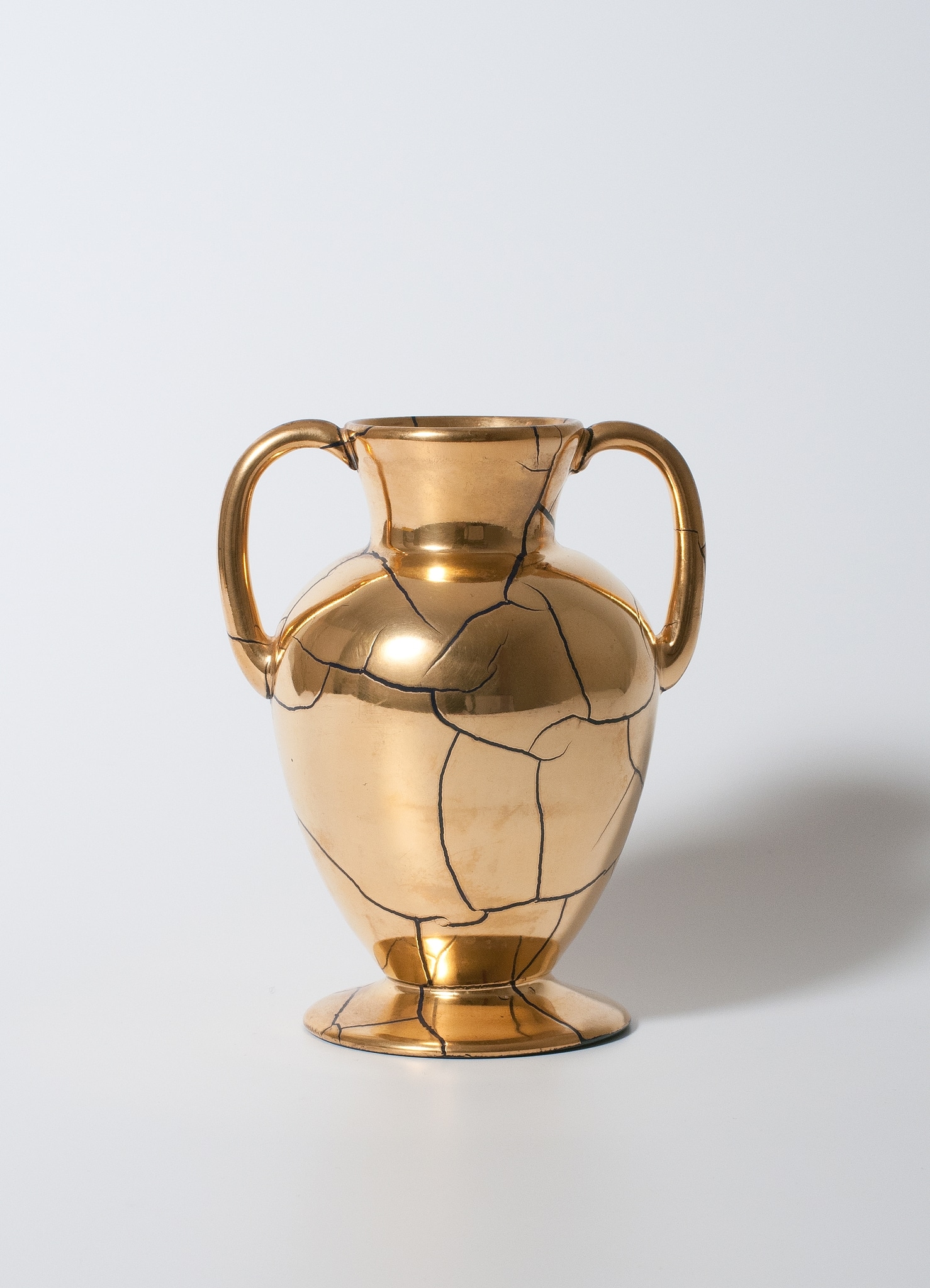Le décor doré craquelé du vase présenté ici est emblématique de la Verrerie artistique, son apparition coïncidant avec la publication du catalogue de 1935. La qualité du craquelé – large et brillant – est caractéristique de l’après-guerre, alors que l’émail bleu utilisé précédemment n’était plus disponible (Walther, 2025, 65).