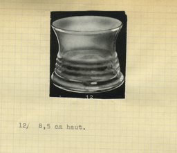 Ce modèle de vase (12) fut créé à une période précoce de la Verrerie artistique de la Verrerie de St-Prex (1930–1964). Les sources dont nous disposons sont des catalogues de la Verrerie de St-Prex, certains inédits. Dans les catalogues non publiés, probablement utilisés entre 1931 et 1935 par les représentants, ce modèle est proposé comme no 301 (Verreries de St-Prex, 1931). Il est muni de différentes décorations qui combinent l'effet satiné du sablage avec des éléments géométriques et des palmettes rouges et vertes, posés à l'aérographe. Le premier catalogue de vente imprimé, datant de 1935, le propose – avec cinq autres modèles en verre incolore sablé et peint au pochoir – comme nouveau numéro 12 (Verreries de St-Prex, 1935, no 12, 1). Un répertoire non publié de toute la production artistique suit la numérotation du catalogue de 1935 (Verreries de St-Prex, 1964). Ce modèle y est également proposé en verre incolore (H 8.5 cm). Finalement, le catalogue de 1951 ne le présente plus (Verreries de St-Prex, 1951).