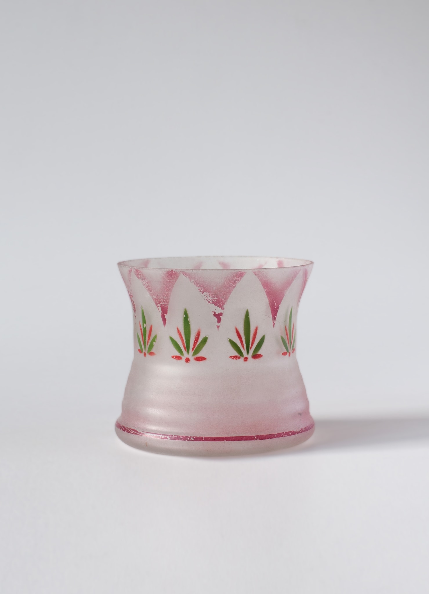 Verre incolore soufflé en moule et sablé puis peint au pochoir. Motifs rouges et verts posés sans cuisson ultérieure; forme: sablier. La moitié inférieure est formée de cinq renflements circulaires. Le bord du vase est meulé et rebrûlé une fois la calotte coupée.