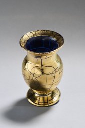 Le décor doré craquelé du vase présenté ici est emblématique de la Verrerie artistique, son apparition coïncidant avec la publication du catalogue de 1935. La qualité du craquelé évoque une phase transitoire entre le serré et peu brillant des débuts et le craquelé large et brillant de l’après-guerre, période marquée par la disparition de l’émail bleu initial (Walther, 2025, 65).