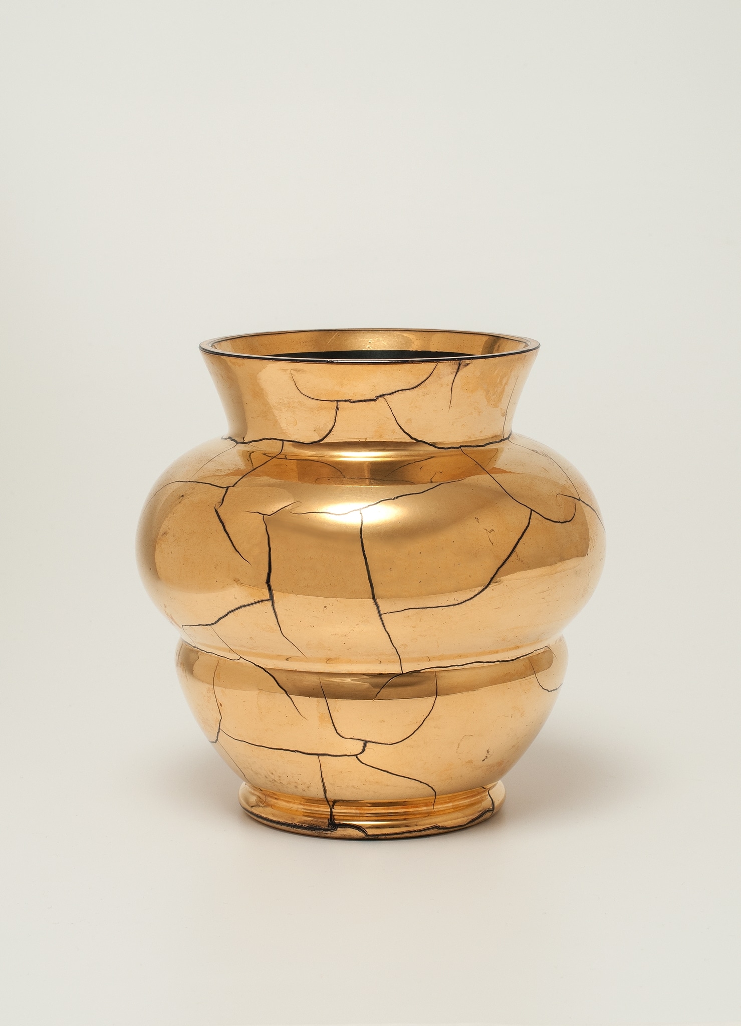 Le décor doré craquelé du vase présenté ici est emblématique de la Verrerie artistique, son apparition coïncidant avec la publication du catalogue de 1935. La qualité du craquelé – large et brillant – est caractéristique de l’après-guerre, alors que l’émail bleu utilisé précédemment n’était plus disponible (Walther, 2025, 65). Selon un inventaire de fin d'année, daté du mois de décembre 1958, ce type de revêtement n'a pas été relevé (Verreries de St-Prex, 1959, 259).