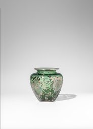 Verre vert, soufflé en moule, décor argenté appliqué par galvanoplastie; forme: panse tronconique, lèvre évasée