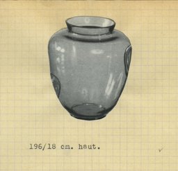 Ce modèle (196) de vase de la Verrerie artistique (1930-1964) a été commercialisé dès 1949. Les sources dont nous disposons sont des catalogues de la Verrerie de St-Prex, certains inédits. Il fait partie du "supplément" publié en 1949 (Verreries de St-Prex, 1949, 7), une offre disponible en verre vert, émaillé noir, rouge, bleu et or craquelé. Il figure enfin dans un répertoire non publié, qui, basé sur les numéros d’inventaire des catalogues de 1935 à 1960, dresse la liste de tous les modèles de la production artistique (Verreries de St-Prex, 1964, H 18). D’après les sources, ce modèle est ainsi mis en vente en 1949 et produit jusqu’en 1964. Dans la critique récente, il est reproduit chez Dreyfus (Dreyfus, 1981, 13 et 21). Au dépôt du Musée du Verrier, il existe aussi deux vases en argent craquelé et noir avec inscription : 9e GIRON DES CHANTEURS DE L'AUBONNE / ST-PREX / 1964.