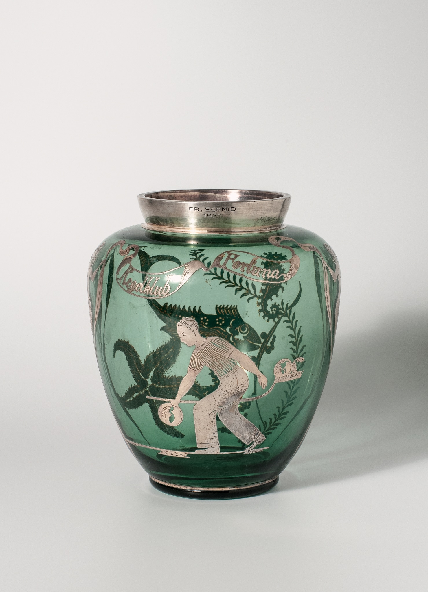 Le vase présenté ici est orné d'un décor appliqué par galvanoplastie. Ce processus électrolytique, permettant de déposer une fine couche de métal sur le verre, est utilisée à Saint-Prex pour des sujets commémoratifs ou des ornements à entrelacs et rinceaux. Notre vase est daté et muni de l'inscription: « FR. SCHMID 1950, Kegelklub Fortuna ». Comme le modèle est introduit en 1949, le décor ne peut être antérieur (Walther, 2025, 66). En revanche, il ne se trouve pas sur des modèles plus récents. On peut encore relever qu'une publication qui traite de la galvanoplastie est publiée en 1949 (Mauder & Springer, 1949). Notre vase est donc à dater vers 1949.