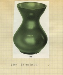Ce modèle de vase (148) fut élaboré vers 1935. Les sources dont nous disposons sont des catalogues de la Verrerie de St-Prex, certains inédits. Il fait partie de l’offre du premier catalogue de vente imprimé en 1935 (Verreries de St-Prex, 1935, no 148, 4), où il est décliné en verre vert uniquement. Il figure ensuite dans un répertoire non publié, qui, basé sur les numéros d’inventaire des catalogues de 1935 à 1960, dresse la liste de tous les modèles de la production artistique (Verreries de St-Prex, 1964 H 23 cm). D’après ces sources, ce modèle a été créé en vue du catalogue de 1935. Il est produit jusqu’en 1964.