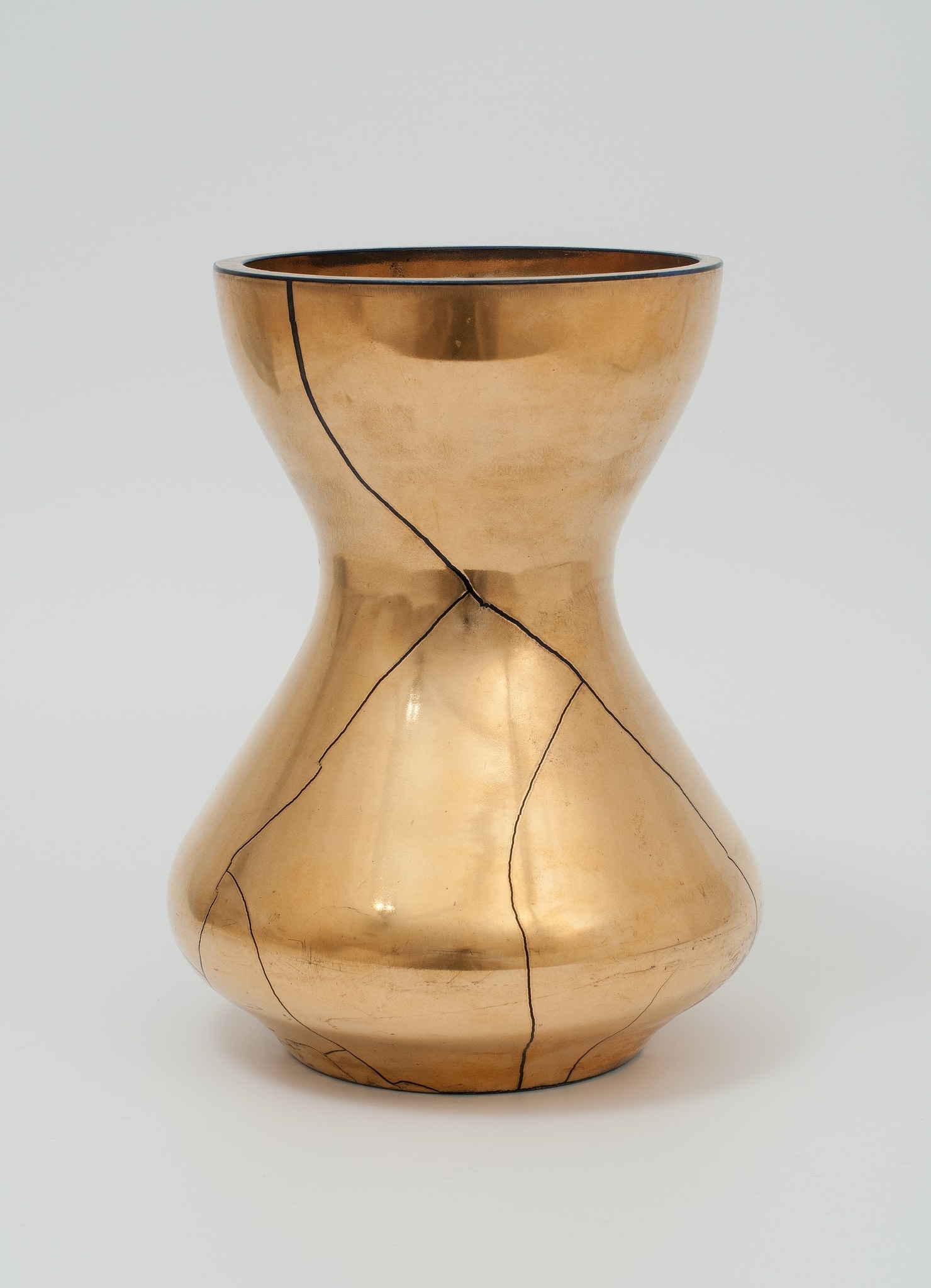 Le décor doré craquelé du vase présenté ici est emblématique de la Verrerie artistique, son apparition coïncidant avec la publication du catalogue de 1935. La qualité du craquelé – large et brillant – est caractéristique de l’après-guerre, période durant laquelle l’émail bleu utilisé précédemment n’était plus disponible (Walther, 2025, 65).