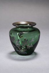 Verre vert, soufflé en moule, décor argenté appliqué par galvanoplastie; forme: panse ovoïde, lèvre évasée